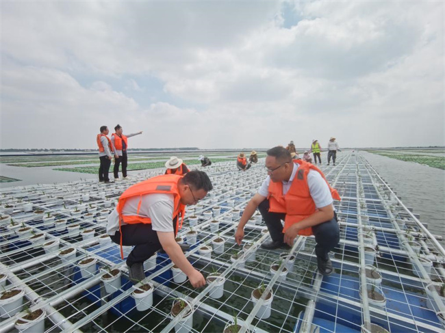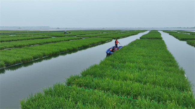 7月30日,項目工作人員在采煤地表沉陷區水面進行田間管理。新華社發 謝睿 攝