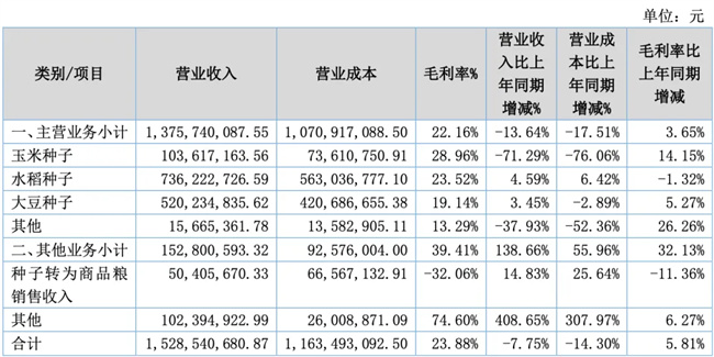 報告顯示,報告期內營業成本發生額116,349.31萬元,較上年同期下降14.30%。墾豐種業稱,原因是公司2024年上半年部分玉米品種種子在推廣、銷售過程中出現客戶訂單量較少的情況,導致公司自有玉米種子銷量下降,故營業成本同比下降。