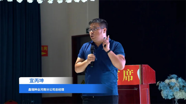 室內會上,鑫瑞種業河南分公司總經理宣丙坤致歡迎詞。首先,他從氣候、耕作模式及土壤狀況等方面分析了黃淮海玉米生產特點,提出了品種穩產性能要好、抗倒能力要強和耐密性要好的選種策略。介紹了鑫瑞25苗齊苗壯,抗高溫結實好,活稈成熟、后期站稈能力強,綜合抗性好、特別對青枯病和南方銹病有很好的抗性的品種綜合優勢。分享了河南分公司應對當前種業重大變化的服務營銷策略及建立聚焦與深耕的營銷規劃。
