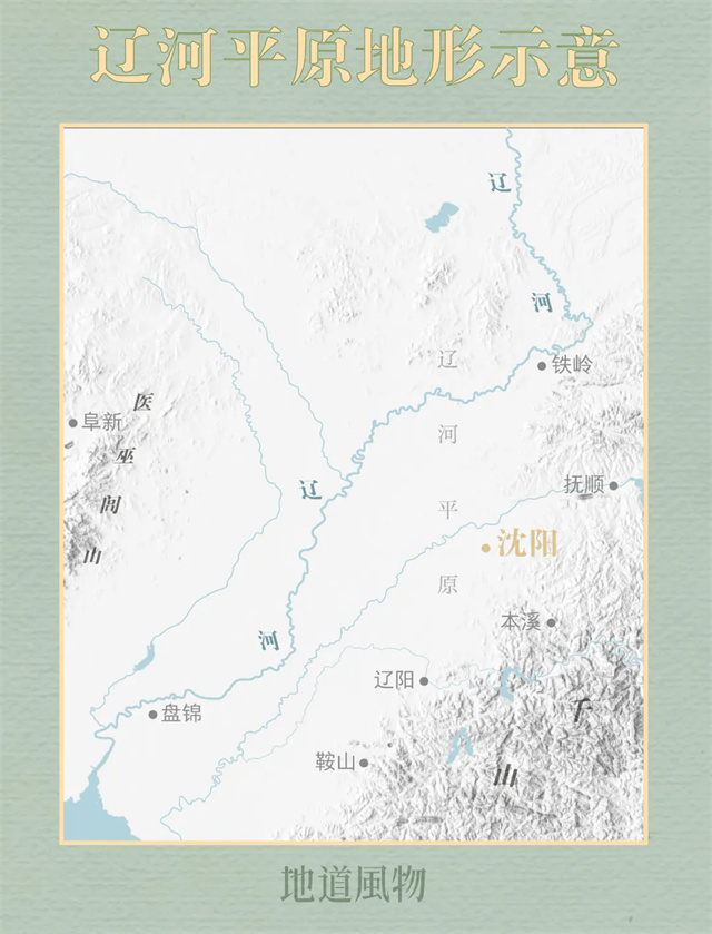 遼河平原:位于遼東丘陵(長白山延伸千山等)與遼西丘陵(遼西山地統稱,包括努魯爾虎山,醫巫閭山等)之間,鐵嶺——彰武之南,直至遼東灣。