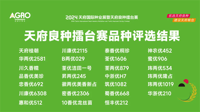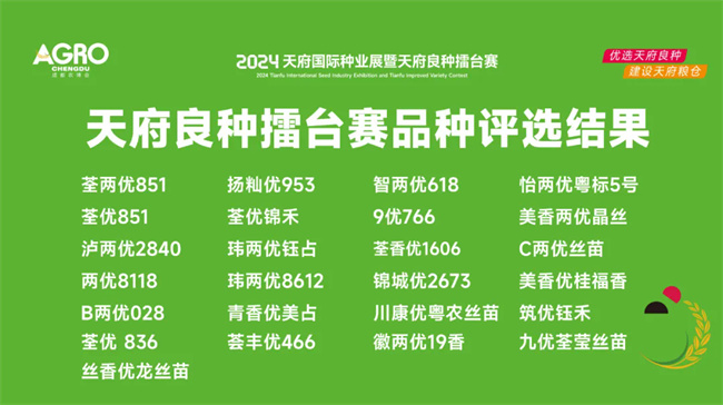 會上,四川省農業科學院黨委委員、副院長丁明忠發布天府良種擂臺賽品種評選結果。天府桂朝、蜀香優668、瀘兩優2840等52個品種獲大會推薦。四川省農業農村廳種業發展處處長沈麗、四川省種子站站長馬暉為獲選代表頒獎。