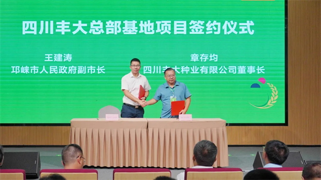 邛崍市人民政府副市長王建濤、四川豐大種業有限公司董事長章存均進行四川豐大總部基地項目簽約