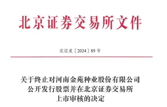 近日,北交所網站發布關于終止對河南金苑種業股份有限公司(以下簡稱“金苑種業”)公開發行股票并在北京證券交易所上市審核的決定。