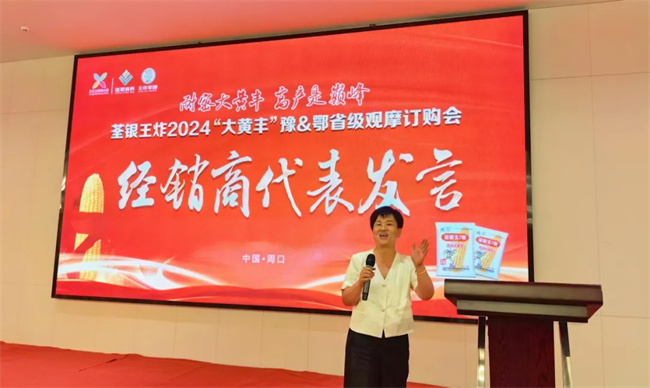 優秀客戶代表周口盈碩農業科技有限公司總經理彭翠英,忍不住上臺分享“荃銀大黃豐”經銷推廣經驗。彭總表示,初期認為“荃銀大黃豐”只是普通品種,但隨著當地零售商不斷上門補貨,引起了她的關注與重視;合作兩年間,彭總用鏡頭記錄了荃銀大黃豐在周口各地驚人表現,她自信地說:經過反復驗證,我可以底氣十足的向老百姓推薦“荃銀大黃豐”,這的的確確是個不多見的好品種!