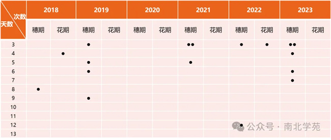 穗分化時期主要統計在6-7月份;花期主要統計在8月份;超過35度5天及以上的多為穗期,出現年份2018,2019,2021,2022,2023;超過35度8天及以上的多為穗期,出現年份2018,2022。為了簡化操作,將6-8月份夏播玉米關鍵生長階段的高溫閾值作為環境鑒定條件,擬定氣象標準。