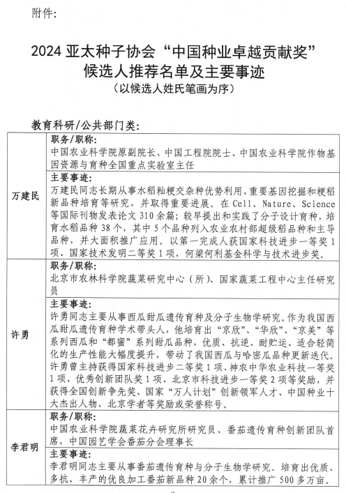 關于2024亞太種子協會“中國種業卓越貢獻獎”候選人推薦名單的公示公告
