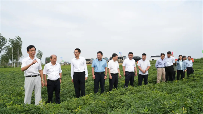 會前,參會嘉賓觀摩了河南省花生良種聯合攻關項目尉氏縣萬畝示范方,對優質、高產、抗病、宜機收花生新品種農大花108、農大花206、農大花201、豫科花1號、沃花2號、沃花6號以及其他新品種田間長勢、飽果率、抗病等情況,進行詳細觀察研判,聽取了金沃野農業董事長李憲挺對萬畝示范方建設情況匯報。