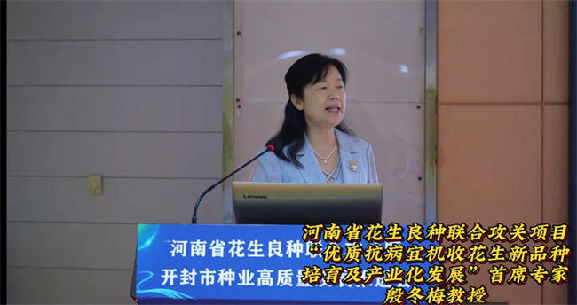 河南省花生良種聯合攻關項目“優質抗病宜機收花生新品種培育及產業化發展”首席專家、河南農業大學教授殷冬梅做項目實施情況匯報。殷冬梅表示,堅持培育出抗性好、產量高,挖掘優異種質資源和新品種創制,通過項目實施,選育抗性更強、品質更優、產量更高的突破性品種是良種聯合攻關的主要目標。