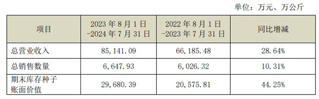 9月19日,豐樂種業披露公司2023-2024種業經營年度經營情況,公司種子經營以上一年的8月1日至次年的7月31日作為一個經營年度。2023年8月1日-2024年7月31日,公司種子業務總營業收入為8.51億元,同比增長28.64%;總銷售數量6647.93萬公斤,同比增長10.31%。公司種業品種結構持續改善,新品種銷售占比逐步增加,種業步入良性發展軌道。