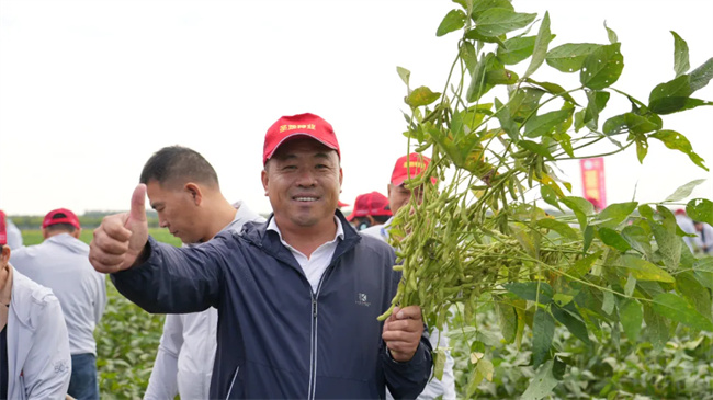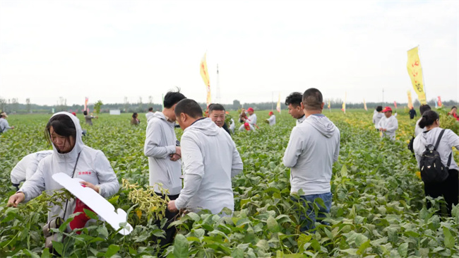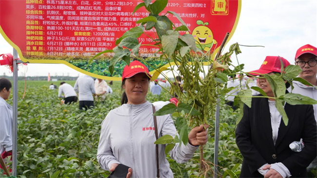 田間觀摩品種豐富,共慶豐收喜悅。名門之后,匠心之作——山寧29,高蛋白(46.4%)、大籽粒、商品性好、抗癥青、高產耐密還抗倒;想成功,先發瘋——神州豆4號要賣瘋,抗性強、抗倒好、結莢多、落黃好,不裂莢;蓋鈞鎰院士團隊選育——南農66,產量高、適應性廣、抗病強、結莢密、易機收;圣地1號,紅毛大豆,大粒、高產、穩產、結莢多、抗性好;蓋鈞鎰院士團隊出品——南農47,高蛋白(45%)、高產穩產、分支多、結莢密、適應性廣、易機收;跟著圣地種業走,幸福日子長長久久!