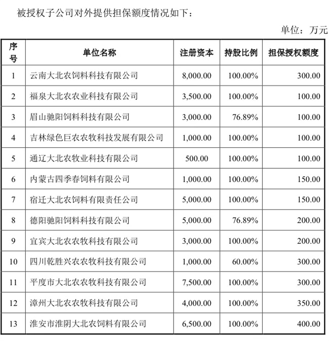 公告稱,為配合市場發展的需要和提高管理效率,促進公司與客戶的深度合作,進一步提高融資效率并促進公司擴大銷售規模,公司擬增加授權北京科高大北農生物科技有限公司為客戶、合作養殖場(戶)及擔保方提供融資擔保,授權擔保額度不超過1,000萬元,主要用于供應鏈金(jin)融貸(dai)款使用,含本次授(shou)權(quan)內,公司(si)授(shou)權(quan)子公司(si)為(wei)客(ke)戶提(ti)供擔保額(e)度(du)累計不超過(guo)人民幣25,050萬元,并將擔保授(shou)權(quan)有效期延(yan)長至2024年年度(du)股東大會召開之(zhi)日。