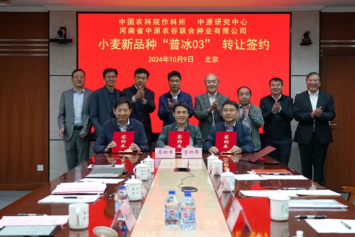 10月9日,中國農業科學院作物科學研究所、中原研究中心與河南省中原農谷聯合種業有限公司在京舉行小麥遠緣雜交新品種“普冰03”使用權轉讓協議簽約儀式。中國農業科學院黨組書記楊振海、中國工程院院士劉旭、中國科學院院士錢前、新鄉市副市長劉軍偉出席會議并講話。