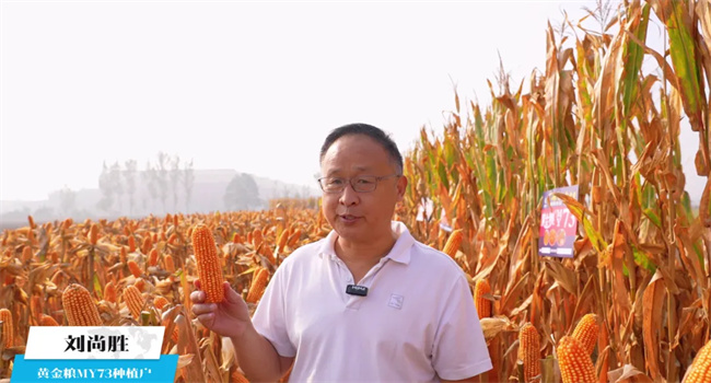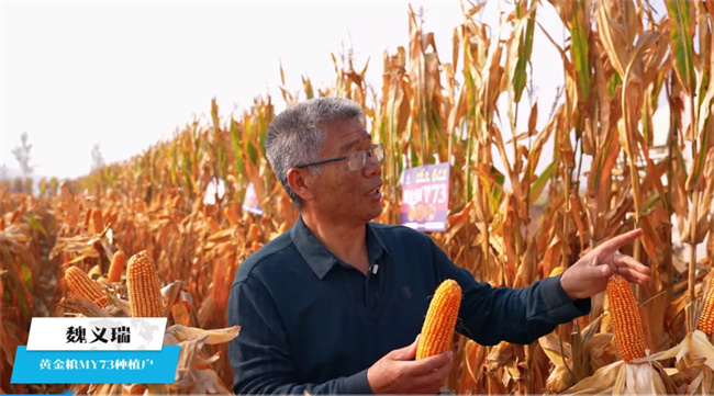 MY73零售商魏義瑞和代理商劉尚勝在接受采訪時均表示,MY73稈子矮、穗位低,抗倒能力好,經過測算,該地塊種植密度為6596株/畝,果穗個頭均勻,穗粒飽滿,顏色光亮,成熟度已非常好。而莖稈卻仍保持青枝綠葉,活稈成熟,收獲期良好的生長狀態,也是玉米高產的鮮明標志,非常期待今天的測產結果。