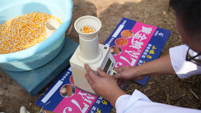 根據玉米田間測產驗收要求,由農技人員、經銷商和種植戶代表組成的測產組,隨機選擇5個定點,科學取樣、詳細記錄、脫粒、折算、稱重。在大家的共同見證下,經測定,黃金糧MY73平均單產為1704.28斤,現場響起熱烈掌聲。