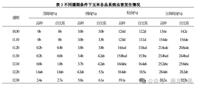2.3 不(bu)(bu)同(tong)(tong)(tong)播(bo)(bo)(bo)(bo)(bo)(bo)(bo)(bo)(bo)期(qi)(qi)(qi)(qi)(qi)(qi)各品系病(bing)(bing)(bing)蟲(chong)(chong)(chong)(chong)害的(de)發(fa)生情況:表 3 反應出不(bu)(bu)同(tong)(tong)(tong)播(bo)(bo)(bo)(bo)(bo)(bo)(bo)(bo)(bo)期(qi)(qi)(qi)(qi)(qi)(qi)玉(yu)米(mi)病(bing)(bing)(bing)蟲(chong)(chong)(chong)(chong)害的(de)發(fa)生情況。可以(yi)看出,播(bo)(bo)(bo)(bo)(bo)(bo)(bo)(bo)(bo)期(qi)(qi)(qi)(qi)(qi)(qi)延(yan)遲莖腐病(bing)(bing)(bing)、銹(xiu)病(bing)(bing)(bing)、粘蟲(chong)(chong)(chong)(chong)和(he)玉(yu)米(mi)螟(ming)蟲(chong)(chong)(chong)(chong)發(fa)病(bing)(bing)(bing)都有不(bu)(bu)同(tong)(tong)(tong)程(cheng)度(du)(du)(du)的(de)增加,播(bo)(bo)(bo)(bo)(bo)(bo)(bo)(bo)(bo)期(qi)(qi)(qi)(qi)(qi)(qi)越(yue)晚病(bing)(bing)(bing)蟲(chong)(chong)(chong)(chong)害越(yue)重。莖腐病(bing)(bing)(bing)方面品系之(zhi)(zhi)(zhi)間(jian)(jian)表現一(yi)致,12月(yue)(yue)(yue)(yue)(yue)(yue)30日(ri)(ri)(ri)(ri)(ri)(ri)播(bo)(bo)(bo)(bo)(bo)(bo)(bo)(bo)(bo)期(qi)(qi)(qi)(qi)(qi)(qi)顯(xian)(xian)(xian)(xian)(xian)著(zhu)(zhu)(zhu)(zhu)(zhu)(zhu)(zhu)高(gao)(gao)(gao)于(yu)12月(yue)(yue)(yue)(yue)(yue)(yue)10日(ri)(ri)(ri)(ri)(ri)(ri)以(yi)前(qian)(qian)(qian)播(bo)(bo)(bo)(bo)(bo)(bo)(bo)(bo)(bo)期(qi)(qi)(qi)(qi)(qi)(qi),其(qi)它播(bo)(bo)(bo)(bo)(bo)(bo)(bo)(bo)(bo)期(qi)(qi)(qi)(qi)(qi)(qi)間(jian)(jian)不(bu)(bu)存在(zai)(zai)(zai)差(cha)異(yi)(yi)(yi)顯(xian)(xian)(xian)(xian)(xian)著(zhu)(zhu)(zhu)(zhu)(zhu)(zhu)(zhu)性;銹(xiu)病(bing)(bing)(bing)方面品系之(zhi)(zhi)(zhi)間(jian)(jian)有所(suo)不(bu)(bu)同(tong)(tong)(tong),雜交種(zhong)12月(yue)(yue)(yue)(yue)(yue)(yue)30日(ri)(ri)(ri)(ri)(ri)(ri)播(bo)(bo)(bo)(bo)(bo)(bo)(bo)(bo)(bo)期(qi)(qi)(qi)(qi)(qi)(qi)顯(xian)(xian)(xian)(xian)(xian)著(zhu)(zhu)(zhu)(zhu)(zhu)(zhu)(zhu)高(gao)(gao)(gao)于(yu)12月(yue)(yue)(yue)(yue)(yue)(yue)10 日(ri)(ri)(ri)(ri)(ri)(ri)以(yi)前(qian)(qian)(qian)播(bo)(bo)(bo)(bo)(bo)(bo)(bo)(bo)(bo)期(qi)(qi)(qi)(qi)(qi)(qi),自(zi)交系12月(yue)(yue)(yue)(yue)(yue)(yue)20日(ri)(ri)(ri)(ri)(ri)(ri)以(yi)后(hou)(hou)播(bo)(bo)(bo)(bo)(bo)(bo)(bo)(bo)(bo)期(qi)(qi)(qi)(qi)(qi)(qi)不(bu)(bu)存在(zai)(zai)(zai)差(cha)異(yi)(yi)(yi)顯(xian)(xian)(xian)(xian)(xian)著(zhu)(zhu)(zhu)(zhu)(zhu)(zhu)(zhu)性,顯(xian)(xian)(xian)(xian)(xian)著(zhu)(zhu)(zhu)(zhu)(zhu)(zhu)(zhu)高(gao)(gao)(gao)于(yu)11 月(yue)(yue)(yue)(yue)(yue)(yue)20日(ri)(ri)(ri)(ri)(ri)(ri)以(yi)前(qian)(qian)(qian)播(bo)(bo)(bo)(bo)(bo)(bo)(bo)(bo)(bo)期(qi)(qi)(qi)(qi)(qi)(qi),12月(yue)(yue)(yue)(yue)(yue)(yue)10日(ri)(ri)(ri)(ri)(ri)(ri)之(zhi)(zhi)(zhi)前(qian)(qian)(qian)播(bo)(bo)(bo)(bo)(bo)(bo)(bo)(bo)(bo)期(qi)(qi)(qi)(qi)(qi)(qi)不(bu)(bu)存在(zai)(zai)(zai)差(cha)異(yi)(yi)(yi)顯(xian)(xian)(xian)(xian)(xian)著(zhu)(zhu)(zhu)(zhu)(zhu)(zhu)(zhu)性;在(zai)(zai)(zai)粘蟲(chong)(chong)(chong)(chong)發(fa)病(bing)(bing)(bing)上品系之(zhi)(zhi)(zhi)間(jian)(jian)也有所(suo)差(cha)異(yi)(yi)(yi),雜交種(zhong)方面12月(yue)(yue)(yue)(yue)(yue)(yue)30日(ri)(ri)(ri)(ri)(ri)(ri)播(bo)(bo)(bo)(bo)(bo)(bo)(bo)(bo)(bo)期(qi)(qi)(qi)(qi)(qi)(qi)顯(xian)(xian)(xian)(xian)(xian)著(zhu)(zhu)(zhu)(zhu)(zhu)(zhu)(zhu)高(gao)(gao)(gao)于(yu)11月(yue)(yue)(yue)(yue)(yue)(yue)30日(ri)(ri)(ri)(ri)(ri)(ri)之(zhi)(zhi)(zhi)前(qian)(qian)(qian)播(bo)(bo)(bo)(bo)(bo)(bo)(bo)(bo)(bo)期(qi)(qi)(qi)(qi)(qi)(qi),12月(yue)(yue)(yue)(yue)(yue)(yue)20日(ri)(ri)(ri)(ri)(ri)(ri)播(bo)(bo)(bo)(bo)(bo)(bo)(bo)(bo)(bo)期(qi)(qi)(qi)(qi)(qi)(qi)顯(xian)(xian)(xian)(xian)(xian)著(zhu)(zhu)(zhu)(zhu)(zhu)(zhu)(zhu)高(gao)(gao)(gao)于(yu)11月(yue)(yue)(yue)(yue)(yue)(yue)20日(ri)(ri)(ri)(ri)(ri)(ri)之(zhi)(zhi)(zhi)前(qian)(qian)(qian)播(bo)(bo)(bo)(bo)(bo)(bo)(bo)(bo)(bo)期(qi)(qi)(qi)(qi)(qi)(qi),12月(yue)(yue)(yue)(yue)(yue)(yue)10日(ri)(ri)(ri)(ri)(ri)(ri)播(bo)(bo)(bo)(bo)(bo)(bo)(bo)(bo)(bo)期(qi)(qi)(qi)(qi)(qi)(qi)顯(xian)(xian)(xian)(xian)(xian)著(zhu)(zhu)(zhu)(zhu)(zhu)(zhu)(zhu)高(gao)(gao)(gao)于(yu)11月(yue)(yue)(yue)(yue)(yue)(yue)10日(ri)(ri)(ri)(ri)(ri)(ri)之(zhi)(zhi)(zhi)前(qian)(qian)(qian)播(bo)(bo)(bo)(bo)(bo)(bo)(bo)(bo)(bo)期(qi)(qi)(qi)(qi)(qi)(qi),其(qi)它播(bo)(bo)(bo)(bo)(bo)(bo)(bo)(bo)(bo)期(qi)(qi)(qi)(qi)(qi)(qi)間(jian)(jian)不(bu)(bu)存在(zai)(zai)(zai)差(cha)異(yi)(yi)(yi)顯(xian)(xian)(xian)(xian)(xian)著(zhu)(zhu)(zhu)(zhu)(zhu)(zhu)(zhu)性;自(zi)交系方面12月(yue)(yue)(yue)(yue)(yue)(yue)20 日(ri)(ri)(ri)(ri)(ri)(ri)之(zhi)(zhi)(zhi)后(hou)(hou)播(bo)(bo)(bo)(bo)(bo)(bo)(bo)(bo)(bo)期(qi)(qi)(qi)(qi)(qi)(qi)顯(xian)(xian)(xian)(xian)(xian)著(zhu)(zhu)(zhu)(zhu)(zhu)(zhu)(zhu)高(gao)(gao)(gao)于(yu)11月(yue)(yue)(yue)(yue)(yue)(yue)30日(ri)(ri)(ri)(ri)(ri)(ri)之(zhi)(zhi)(zhi)前(qian)(qian)(qian)播(bo)(bo)(bo)(bo)(bo)(bo)(bo)(bo)(bo)期(qi)(qi)(qi)(qi)(qi)(qi),12月(yue)(yue)(yue)(yue)(yue)(yue)10 日(ri)(ri)(ri)(ri)(ri)(ri)之(zhi)(zhi)(zhi)后(hou)(hou)播(bo)(bo)(bo)(bo)(bo)(bo)(bo)(bo)(bo)期(qi)(qi)(qi)(qi)(qi)(qi)顯(xian)(xian)(xian)(xian)(xian)著(zhu)(zhu)(zhu)(zhu)(zhu)(zhu)(zhu)高(gao)(gao)(gao)于(yu)11 月(yue)(yue)(yue)(yue)(yue)(yue)20日(ri)(ri)(ri)(ri)(ri)(ri)之(zhi)(zhi)(zhi)前(qian)(qian)(qian)播(bo)(bo)(bo)(bo)(bo)(bo)(bo)(bo)(bo)期(qi)(qi)(qi)(qi)(qi)(qi),11月(yue)(yue)(yue)(yue)(yue)(yue)30日(ri)(ri)(ri)(ri)(ri)(ri)之(zhi)(zhi)(zhi)后(hou)(hou)播(bo)(bo)(bo)(bo)(bo)(bo)(bo)(bo)(bo)期(qi)(qi)(qi)(qi)(qi)(qi)顯(xian)(xian)(xian)(xian)(xian)著(zhu)(zhu)(zhu)(zhu)(zhu)(zhu)(zhu)高(gao)(gao)(gao)于(yu)11月(yue)(yue)(yue)(yue)(yue)(yue)10日(ri)(ri)(ri)(ri)(ri)(ri)之(zhi)(zhi)(zhi)前(qian)(qian)(qian)播(bo)(bo)(bo)(bo)(bo)(bo)(bo)(bo)(bo)期(qi)(qi)(qi)(qi)(qi)(qi),其(qi)它播(bo)(bo)(bo)(bo)(bo)(bo)(bo)(bo)(bo)期(qi)(qi)(qi)(qi)(qi)(qi)間(jian)(jian)不(bu)(bu)存在(zai)(zai)(zai)差(cha)異(yi)(yi)(