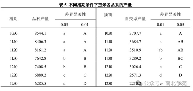 對(dui)不同(tong)播(bo)期(qi)(qi)(qi)(qi)(qi)(qi)(qi)(qi)品(pin)系產(chan)量(liang)(liang)進(jin)行方(fang)差(cha)(cha)(cha)分析和(he)顯(xian)(xian)(xian)(xian)著(zhu)(zhu)(zhu)性(xing)檢驗,結果列于(yu)表5。可以看出,雜交種(zhong)(zhong)方(fang)面(mian) 10月(yue)(yue)(yue)30日(ri)(ri)(ri)(ri)(ri)(ri)播(bo)期(qi)(qi)(qi)(qi)(qi)(qi)(qi)(qi)產(chan)量(liang)(liang)最(zui)高(gao)(gao)(gao)(gao)達(da) 8544.1kg/hm2,隨播(bo)期(qi)(qi)(qi)(qi)(qi)(qi)(qi)(qi)延后(hou)產(chan)量(liang)(liang)逐漸降低(di),12月(yue)(yue)(yue)30日(ri)(ri)(ri)(ri)(ri)(ri)播(bo)期(qi)(qi)(qi)(qi)(qi)(qi)(qi)(qi)產(chan)量(liang)(liang)最(zui)低(di)為6285.5 kg/hm2,11月(yue)(yue)(yue)20日(ri)(ri)(ri)(ri)(ri)(ri)之(zhi)(zhi)(zhi)前(qian)(qian)播(bo)期(qi)(qi)(qi)(qi)(qi)(qi)(qi)(qi)產(chan)量(liang)(liang)極顯(xian)(xian)(xian)(xian)著(zhu)(zhu)(zhu)高(gao)(gao)(gao)(gao)于(yu)11月(yue)(yue)(yue)30日(ri)(ri)(ri)(ri)(ri)(ri)之(zhi)(zhi)(zhi)后(hou)播(bo)期(qi)(qi)(qi)(qi)(qi)(qi)(qi)(qi),12 月(yue)(yue)(yue)10日(ri)(ri)(ri)(ri)(ri)(ri)之(zhi)(zhi)(zhi)前(qian)(qian)播(bo)期(qi)(qi)(qi)(qi)(qi)(qi)(qi)(qi)極顯(xian)(xian)(xian)(xian)著(zhu)(zhu)(zhu)高(gao)(gao)(gao)(gao)于(yu) 12 月(yue)(yue)(yue) 20 日(ri)(ri)(ri)(ri)(ri)(ri)之(zhi)(zhi)(zhi)后(hou)播(bo)期(qi)(qi)(qi)(qi)(qi)(qi)(qi)(qi),12 月(yue)(yue)(yue) 20 日(ri)(ri)(ri)(ri)(ri)(ri)之(zhi)(zhi)(zhi)前(qian)(qian)播(bo)期(qi)(qi)(qi)(qi)(qi)(qi)(qi)(qi)極顯(xian)(xian)(xian)(xian)著(zhu)(zhu)(zhu)高(gao)(gao)(gao)(gao)于(yu) 12 月(yue)(yue)(yue) 30日(ri)(ri)(ri)(ri)(ri)(ri)播(bo)期(qi)(qi)(qi)(qi)(qi)(qi)(qi)(qi),其(qi)它(ta)播(bo)期(qi)(qi)(qi)(qi)(qi)(qi)(qi)(qi)間不存(cun)在差(cha)(cha)(cha)異顯(xian)(xian)(xian)(xian)著(zhu)(zhu)(zhu)性(xing);自交系的產(chan)量(liang)(liang)變化趨勢與雜交種(zhong)(zhong)相同(tong), 10月(yue)(yue)(yue)30日(ri)(ri)(ri)(ri)(ri)(ri)播(bo)期(qi)(qi)(qi)(qi)(qi)(qi)(qi)(qi)產(chan)量(liang)(liang)最(zui)高(gao)(gao)(gao)(gao)為 3707.7kg/hm2,12 月(yue)(yue)(yue) 30 日(ri)(ri)(ri)(ri)(ri)(ri)播(bo)期(qi)(qi)(qi)(qi)(qi)(qi)(qi)(qi)產(chan)量(liang)(liang)最(zui)低(di)為 2210.2 kg/hm2,10 月(yue)(yue)(yue) 30 日(ri)(ri)(ri)(ri)(ri)(ri)播(bo)期(qi)(qi)(qi)(qi)(qi)(qi)(qi)(qi)極顯(xian)(xian)(xian)(xian)著(zhu)(zhu)(zhu)高(gao)(gao)(gao)(gao)于(yu) 11 月(yue)(yue)(yue) 30 日(ri)(ri)(ri)(ri)(ri)(ri)之(zhi)(zhi)(zhi)后(hou)播(bo)期(qi)(qi)(qi)(qi)(qi)(qi)(qi)(qi),11 月(yue)(yue)(yue) 20 日(ri)(ri)(ri)(ri)(ri)(ri)之(zhi)(zhi)(zhi)前(qian)(qian)播(bo)期(qi)(qi)(qi)(qi)(qi)(qi)(qi)(qi)極顯(xian)(xian)(xian)(xian)著(zhu)(zhu)(zhu)高(gao)(gao)(gao)(gao)于(yu) 12 月(yue)(yue)(yue) 10 日(ri)(ri)(ri)(ri)(ri)(ri)之(zhi)(zhi)(zhi)后(hou)播(bo)期(qi)(qi)(qi)(qi)(qi)(qi)(qi)(qi),11 月(yue)(yue)(yue) 30 日(ri)(ri)(ri)(ri)(ri)(ri)之(zhi)(zhi)(zhi)前(qian)(qian)播(bo)期(qi)(qi)(qi)(qi)(qi)(qi)(qi)(qi)極顯(xian)(xian)(xian)(xian)著(zhu)(zhu)(zhu)高(gao)(gao)(gao)(gao)于(yu) 12 月(yue)(yue)(yue) 20 日(ri)(ri)(ri)(ri)(ri)(ri)之(zhi)(zhi)(zhi)后(hou)播(bo)期(qi)(qi)(qi)(qi)(qi)(qi)(qi)(qi),12 月(yue)(yue)(yue) 10 日(ri)(ri)(ri)(ri)(ri)(ri)、12 月(yue)(yue)(yue) 20 日(ri)(ri)(ri)(ri)(ri)(ri)和(he) 12 月(yue)(yue)(yue) 30日(ri)(ri)(ri)(ri)(ri)(ri)播(bo)期(qi)(qi)(qi)(qi)(qi)(qi)(qi)(qi)之(zhi)(zhi)(zhi)間均(jun)存(cun)在極顯(xian)(xian)(xian)(xian)著(zhu)(zhu)(zhu)差(cha)(cha)(cha)異性(xing),11 月(yue)(yue)(yue) 10 日(ri)(ri)(ri)(ri)(ri)(ri)和(he) 11 月(yue)(yue)(yue) 30 日(ri)(ri)(ri)(ri)(ri)(ri)播(bo)期(qi)(qi)(qi)(qi)(qi)(qi)(qi)(qi)之(zhi)(zhi)(zhi)間不存(cun)在極顯(xian)(xian)(xian)(xian)著(zhu)(zhu)(zhu)差(cha)(cha)(cha)異性(xing),但差(cha)(cha)(cha)異達(da)到顯(xian)(xian)(xian)(xian)著(zhu)(zhu)(zhu)水平,其(qi)它(ta)播(bo)期(qi)(qi)(qi)(qi)(qi)(qi)(qi)(qi)之(zhi)(zhi)(zhi)間不存(cun)在差(cha)(cha)(cha)異顯(xian)(xian)(xian)(xian)著(zhu)(zhu)(zhu)性(xing)。通過以上(shang)品(pin)系產(chan)量(liang)(liang)結果得出,南繁(fan)適時早(zao)播(bo)會有(you)效提高(gao)(gao)(gao)(gao)玉(yu)米產(chan)量(liang)(liang)。對(dui)于(yu)繁(fan)、制種(zhong)(zhong)來說,在躲(duo)避臺風影響后(hou),盡早(zao)整地、播(bo)種(zhong)(zhong),充分利用光熱條件,適時灌(guan)溉并加強田間管(guan)理,為實(shi)現(xian)較(jiao)高(gao)(gao)(gao)(gao)產(chan)量(liang)(liang)奠定良好基礎。