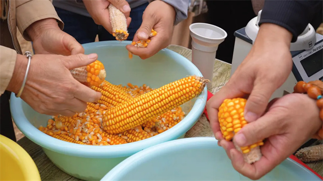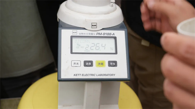 測產前,測產組首先對測產地塊進行了整體評估,在50畝連片種植的“華農689”中隨機選取了種植密度為5800株/畝的1.89畝地塊,依據農業農村部主要農作物實打實收有關測產程序和辦法進行了測產。經測產:實收籽粒鮮重4336斤,籽粒含水率為26.4%,折合14%標準含水量,平均產量為1963斤/畝。