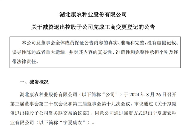 根(gen)據此前公(gong)告,此次減持(chi),為康農(nong)(nong)種業根(gen)據公(gong)司(si)戰(zhan)略發展規劃并與(yu)寧夏康農(nong)(nong)種業有(you)限公(gong)司(si)協商,通過減資方式退出寧夏康農(nong)(nong)。