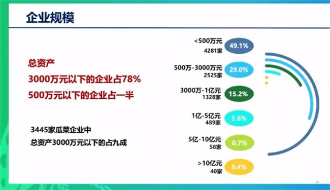 從企業的規模來看,我國的種業企業還是以3,000萬元以下的中小企業為主體,總資產3,000萬元以下的企業占近8成,500萬元以下的企業占了一半,特別是對于瓜菜企業,3400多家瓜菜企業中,總資產3,000萬元以下的占了9成。