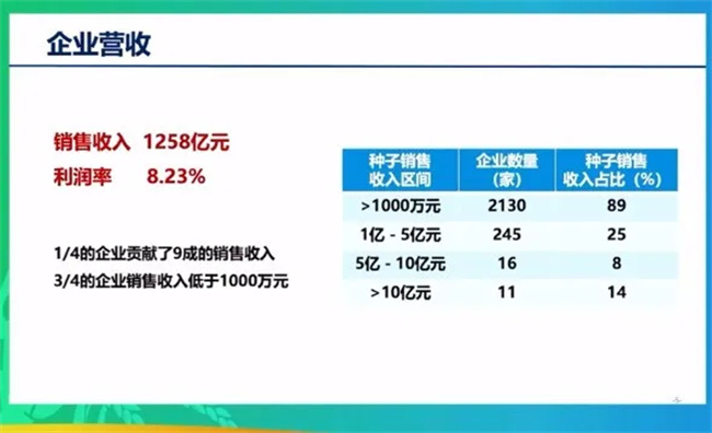 從企業的營收看,2023年全國種業企業共實現種子銷售收入1,258億元,平均的利潤率8.23%,1/4企業貢獻銷售收入的9成, 3/4的企業銷售收入低于1,000萬元。具體來看,銷售收入超過1,000萬元以上的企業有2130家,占種子銷售收入的89%;1億元到5億元的企業有245家,占種子銷售收入的25%;5億元到10億元的企業16家,占種子銷售收入的8%;超過10億元的企業11家,占種子銷售收入的14%。