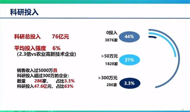 從科研投入看,全國種業企業的科研總投入76億元,平均投入強度6%。這一數據是農業高新技術產業企業的2.3倍,這也體現了種業是高科技的產業,是農業的芯片。但是,也可以看出有3876家企業沒有研發投入,研發投入超過50萬元的種業企業有1828家,占比21%;銷售收入超過5,000萬元,并且科研投入超過300萬元的企業有286家,占比3.3%。