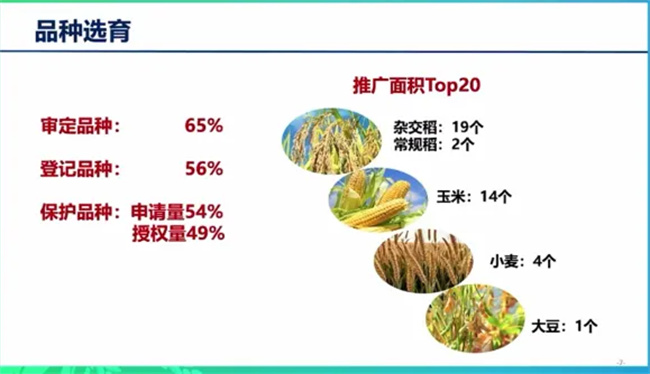從品種的選育看,企業是品種選育的主體,通過國家級和省級審定的品種中,由企業選育的占65%。登記品種中,由企業登記的占近6成,新品種保護中有企業申請的超過50%,授權品種中有一半來自企業,從推廣面積前20強的4大作物來看,有19個雜交稻、2個常規稻、14個玉米、4個小麥和1個大豆是由企業選育的。