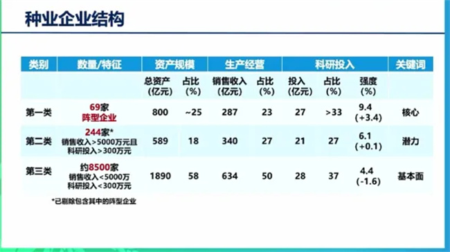 第二類是銷售超超收入超過5,000萬元,并且科研投入超過300萬元,具有較好發展潛力的企業共244家,不包括其中的陣型企業。這些企業總資產589億元,占行業總值的近兩成,種子銷售收入340億元,占行業總值的近三成,科研投入21億元,也占行業總值的近三成,科研投入強度6.1%,與行業平均值相當。這些企業是行業的中堅力量,要加強政策引導,營造良好市場環境,更好服務種業高質量發展。