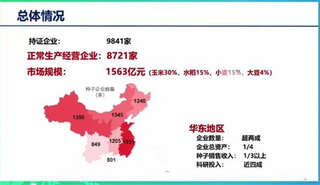2024年10月30日,在第二十一屆全國種子雙交會上,農業農村部種業管理司創新發展處四級研究員鄧超做《我國農作物種業企業發展情況分析》報告時指出,我國種業企業是現代種業發展的主力軍,是推動實現種業科技自立自強種源自主可控的重要力量。今年以來,種業管理司會同全國農技中心等有關單位對我國的農作物種業企業進行了深入分析,初步梳理了企業的構成類型,為今后企業扶優工作更加聚焦、更加精準、更加有力提供有力支撐。總的來看,2023年全國共有持證種業企業9841家,其中正常生產經營的8721家,農作物種子市場規模首次突破1,500億元,達到了1,563億元。其中四大作物玉米、水稻、小麥、大豆占到了總產值的64%。從區域來看,華東地區是我國農作物最大的優勢區,其企業數量超過全國的兩成,種子企業的總資產超過1/4,種子銷售收入在1/3以上,種業的科研投入占全國的近4成。