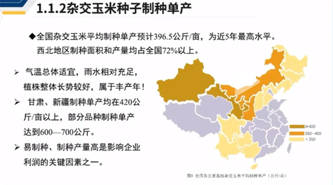全國雜交玉米平均制種單產預計 396.5 公斤/畝,為近 5 年最高水平。西北地區制種面積和產量均占全國 72% 以上。甘肅、新疆制種單產均在 420 公斤/畝以上,部分品種制種單產達 600-700 公斤。易制種、制種產量高是影響企業利潤的關鍵因素之一。