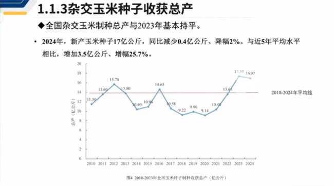 全國雜交玉米制種總產與 2023 年基本持平。2024 年,新產玉米種子 17 億公斤,同比減少 0.4 億公斤、降幅 2%。與近 5 年平均水平相比,增加 3.5 億公斤、增幅 25.7%。