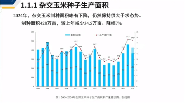 其中,玉米方面,2024 年,雜交玉米制種面積略有下降,仍然保持供大于求態勢。制種面積 428 萬畝,較上年減少 34.5 萬畝、降幅 7%。