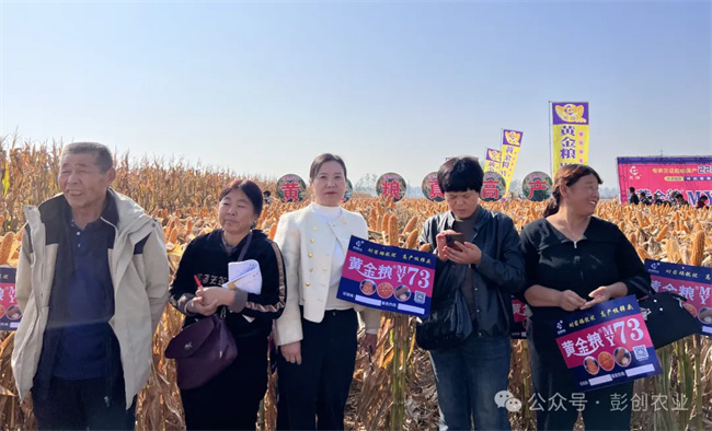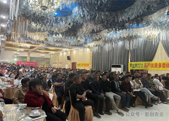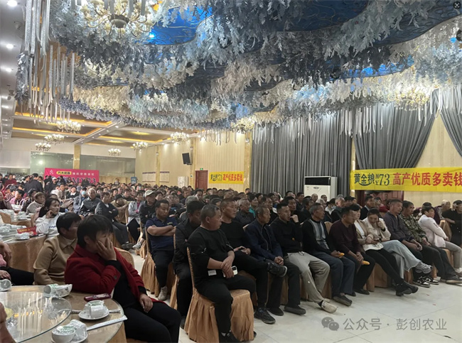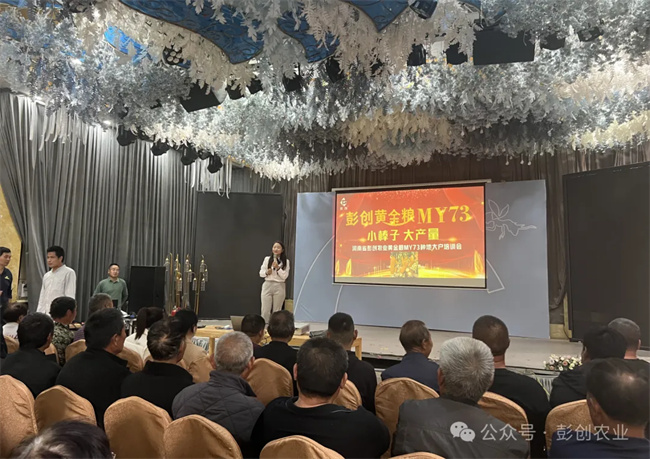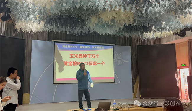 一心一意黃金糧,打贏種業翻身仗!室內會議階段,彭創農業總經理楊雪利女士分析了現如今的種子市場發展前景,分享了黃金糧MY73品種特征特性,并邀請當地縣級代理商、零售商、種地大戶進行分享,列舉了一個個近年來各地創高產案例,強調黃金糧MY73矮抗密綜合優勢,及奪高產的潛質,助力農民增產增收!