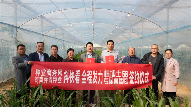 2024年11月5日,種業商務網“抖快看”全程發力河南秀青種業有限公司“棒博士58”專屬直播間簽約儀式在鄭州市圓滿舉行。種業商務網主任董偉、“抖快看”項目負責人吉芳,秀青種業副總經理王曉飛、鄭文闖等共同出席簽約儀式。