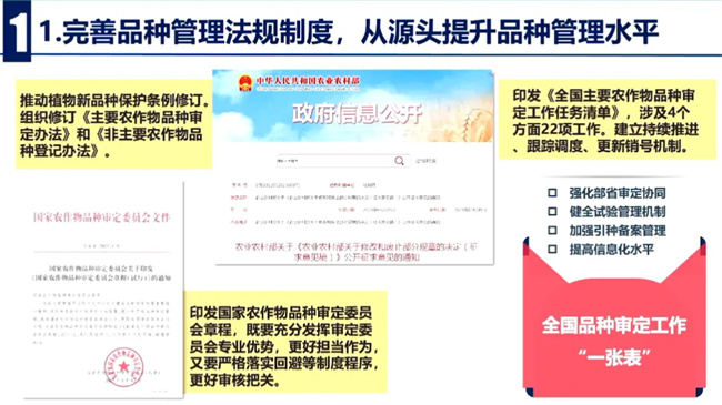 一是完善品種管理法規制度。從源頭提升品種管理水平,貫徹實施新修改種子法,配合司法部修改植物新品種保護條例,強化植物新品種保護,組織修訂主要農作物品種審定辦法和非主要農作物品種登記辦法,提高聯合體試驗準入門檻,強化DNA分子檢測技術應用,制定國家農作物品種審定委員會章程,優化工作流程,強化回避保密等廉政風險防控,嚴格依法科學公正地開展品種審定,強化部省協同,印發全國品種審定工作一張表,建立持續跟進跟蹤調度,更新銷號機制,切實提高審定品種的質量和服務水平。