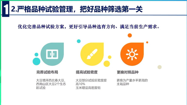 圍繞農業生產緊迫需求,堅持問題導向和系統觀念,完善品種管理制度,規范品種試驗,提高審定標準,強化展示推薦,暢通退出機制,把嚴格管理保護創新貫穿品種選育推廣的全過程各環節,加快建立品種全生命周期管理制度,夯實糧油大面積單產提升的品種支撐。