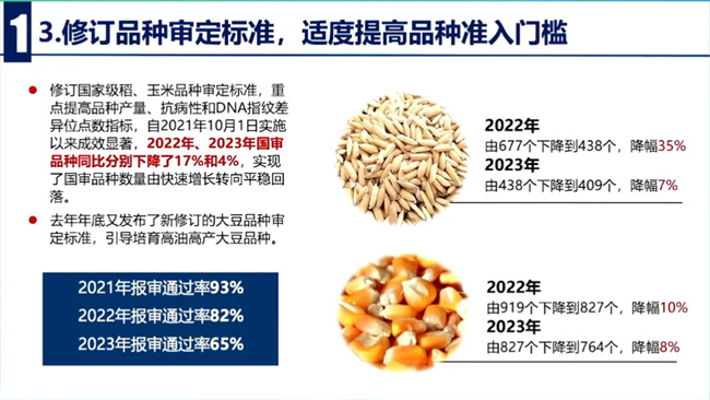 三是修訂品種審定標準,適度提高品種準入門檻。圍繞適應穩產保供戰略性需求,當前生產的緊迫需求和未來發展的前瞻性需求的鮮明導向,國家農作物品種審定委員會先后修訂發布了國家水稻、玉米、大豆品種審定標準,目前正在推進修訂小麥、棉花品種審定標準,重點提高品種產量、品質、抗病抗逆性和DNA分子指紋差異位點等指標要求,引導培育突破性新品種,推動地方及時修訂省級品種審定標準,同步提高品種準準入門檻,向業界傳遞從嚴要求的明確信號。近兩年,國審品種數量分別下降了17%和4%,全國審定品種數量從2023年開始回落,品種選育水平不斷提升。