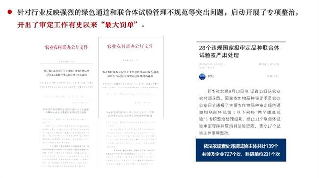 2024年5月20日,農業農村部種業管理司召開國家主要農作物品種審定綠色通道和聯合體試驗專項整治進展通報視頻會,通報2022年8月啟動專項整治以來工作進展情況(先后發現并依法依規查處問題試驗主體139個次,其中綠色通道試驗35個次、聯合體試驗104個次),強調要嚴格審定標準,合理提高審定門檻;規范品種試驗,強化各渠道試驗監督管理;完善管理制度,盡快出臺主要農作物品種試驗管理辦法;加強展示示范,加快優良品種推廣應用;強化部省協同,切實提高審定品種質量和服務水平。