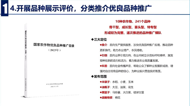 四是開展品種展示評價。分類推薦、優良品種推廣,建立健全全國品種展示評價網絡,涵蓋糧、源、油、糖、蔬菜、瓜果等作物,每年展示示范的品種超過1萬個次,輻射帶動主產區及農戶看禾選種。從2023年開始,農業農村部編制發布了國家農作物優良品種推廣目錄,按照骨干型、成長型、苗頭型和特專型4種類型,分類遴選,推薦水稻、小麥、玉米、大豆、油菜、花生、馬鈴薯等10種作物,241個優良品種,推出了較為完整依次推進的品種推廣梯隊。廣西、山東、吉林等地也結合本地實際,相繼發布了省級優良品種推廣目錄,更好地指導農民科學選種用種,加快推動品種更新換代。
