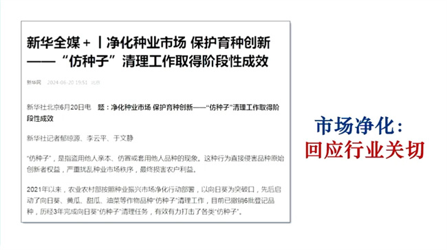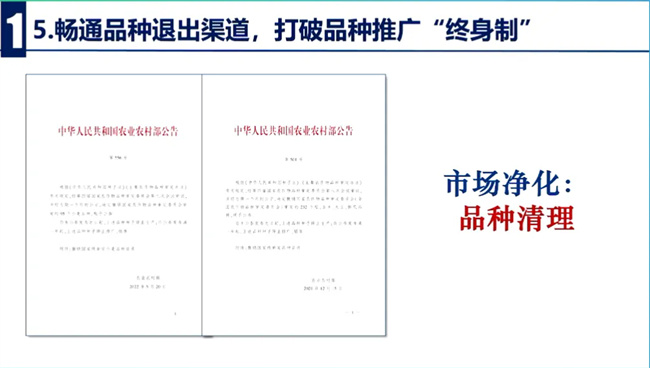 此外,近期農業農村部種業管理司印發了關于常態化推進品種審定綠色通道,聯合體試驗整治和仿種子清理的通知。從深化兩個通道試驗專項整治、加快防種子專項清理、嚴格自主DUS測試管理、規范品種命名管理、加強品種標準樣品管理等5個方面,明確了嚴格品種管理的具體要求和措施,同時啟動開展DUS測試專項整治和品種名稱的專項清理兩項具體行動。