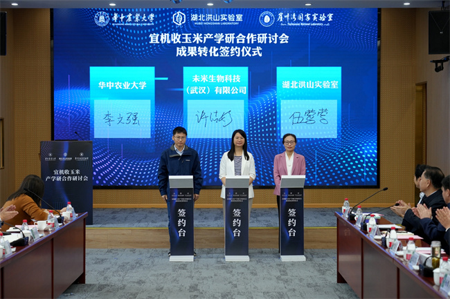 11月13日,華中農業大學作物遺傳改良全國重點實驗室、湖北洪山實驗室、崖州灣國家實驗室,在湖北省武漢市聯合舉行宜機收玉米產學研合作研討會。記者從會上獲悉,華中農業大學校長嚴建兵教授團隊,經過多年持續科研攻關,找到一個關鍵基因,利用該基因可以實現玉米收獲時籽粒含水量降低。目前,相關技術已在我國黃淮海及東北等地區展開測試,并同步啟動科技成果轉化,有望提升我國玉米籽粒機械化收割水平。