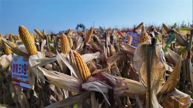 黃斤玉浚黎99測產田,呈現出一派豐收景象。金黃色的玉米穗子大小勻稱,每一顆籽粒都充盈飽滿。經過將近150天的種植,浚黎99依然存有青葉,站稈能力得到參會人員的高度肯定和認可。