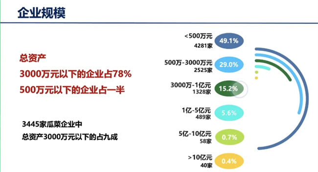 值得注意的是,總資產在3000萬元以下的企業占78%,500萬元以下的企業占一半。尤其是瓜菜企業,3445家瓜菜企業中,總資產3000萬元以下的占9成。