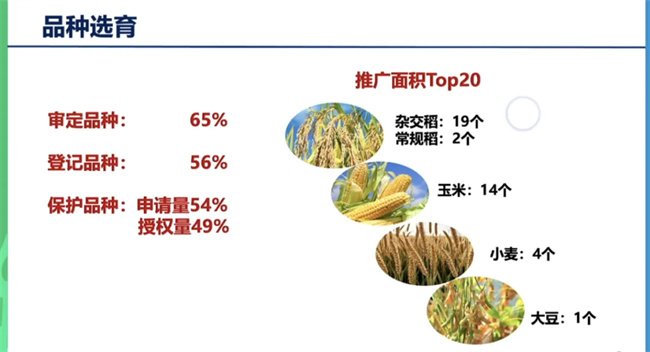 在全國推廣面積前二十的四大作物來看,由企業選育的有19個雜交稻、2個常規稻、14個玉米、4個小麥和1個大豆。