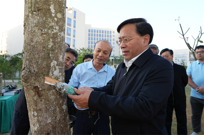 中國熱帶農業科學院是國家級綜合性熱帶農業科學研究機構,近年來持續推進熱帶農業科技創新,取得一批突破性成果。韓俊先后來到橡膠研究所、環境與植物保護所調研,走進膠園實地了解高產橡膠樹品種培育、特種天然橡膠加工、機械割膠等情況,在實驗室聽取病蟲害監測與綠色防控、農業環境監測與污染治理等方面的研究進展,并主持召開座談會,與熱科院科研人員深入交流。韓俊對中國熱帶農業科學院建院70周年表示祝賀,對熱科院近年來在熱帶農業科技研發應用方面取得的成就表示肯定。他強調,要認真貫徹落實習近平總書記關于打造國家熱帶農業科學中心的重要指示精神,緊盯前瞻性戰略性科技課題強化基礎研究,盡快突破高性能天然橡膠生產等技術瓶頸,把科研成果轉化為現實生產力。要繼續做好“一所對一縣”等技術服務工作,助力海南鞏固拓展脫貧攻堅成果,服務海南自貿港建設和熱區鄉村振興。要進一步強化熱區農業科技國際合作,扎實做好技術援外和培訓工作,持續提升國際影響力競爭力。要抓實人才隊伍建設,進一步健全人才培養、選拔、使用和管理機制,最大限度激發人才創新創造活力。