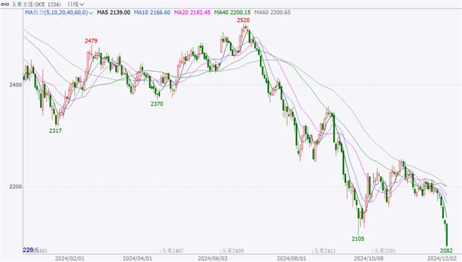 玉米期貨創出2020年7月以來新低,12月4日主力合約收盤報2084元/噸,當日最低2082元/噸。現貨方面,去年玉米還能賣到1.3元/斤左右,今年9-10月,部分地區玉米只能賣到0.95元/斤左右。