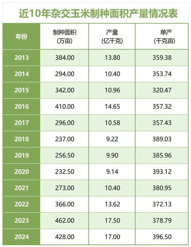 2016年以來,全國玉米制種面積和產量呈先減后增態勢。玉米制種面積由2016年的410萬畝,下降到2020年的230萬畝,后逐步增加,2023年制種面積大幅回彈至462萬畝,2024年,428萬畝。