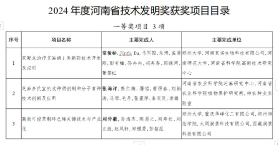 授予“雙靶點治療艾滋病1類新藥技術開發及應用”等13項成果河南省技術發明獎,其中一等獎3項、二等獎6項、三等獎4項;