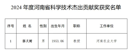 經省委科技委員會會議研究和省政府常務會議審議,決定授予郭天財教授2024年度河南省科學技術杰出貢獻獎;