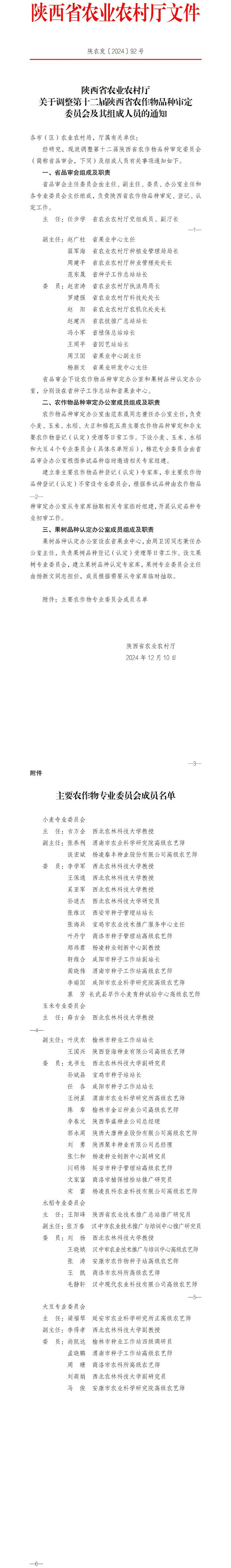 第十二屆陜西省農作物品種審定委員會及其組成人員調整