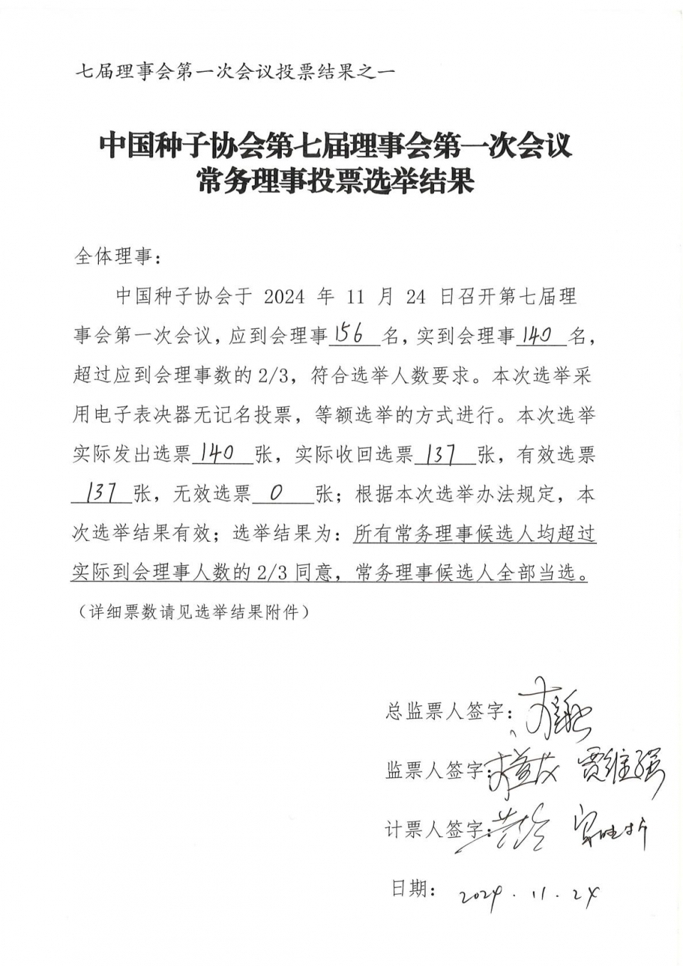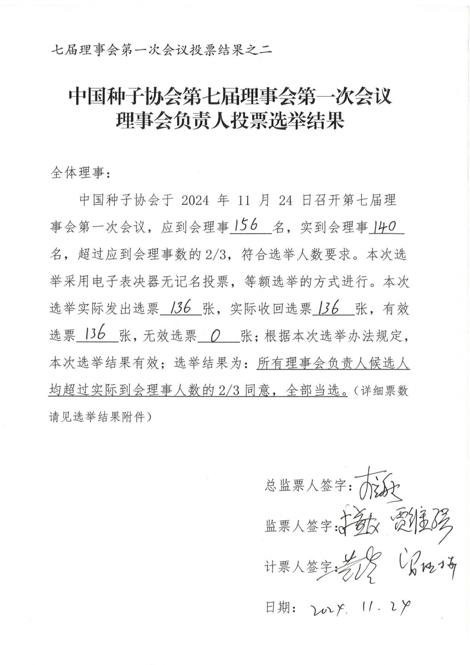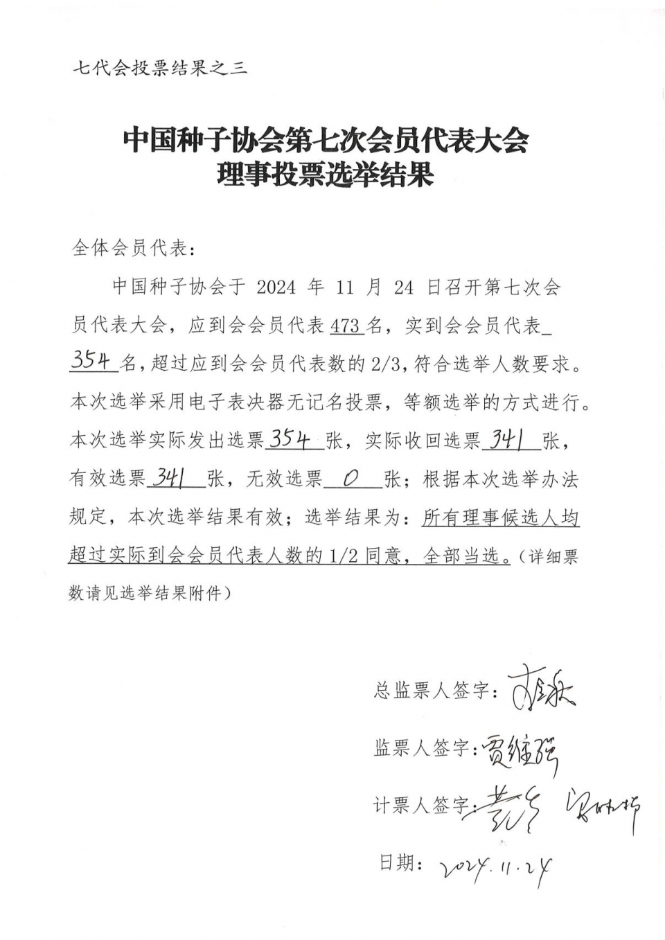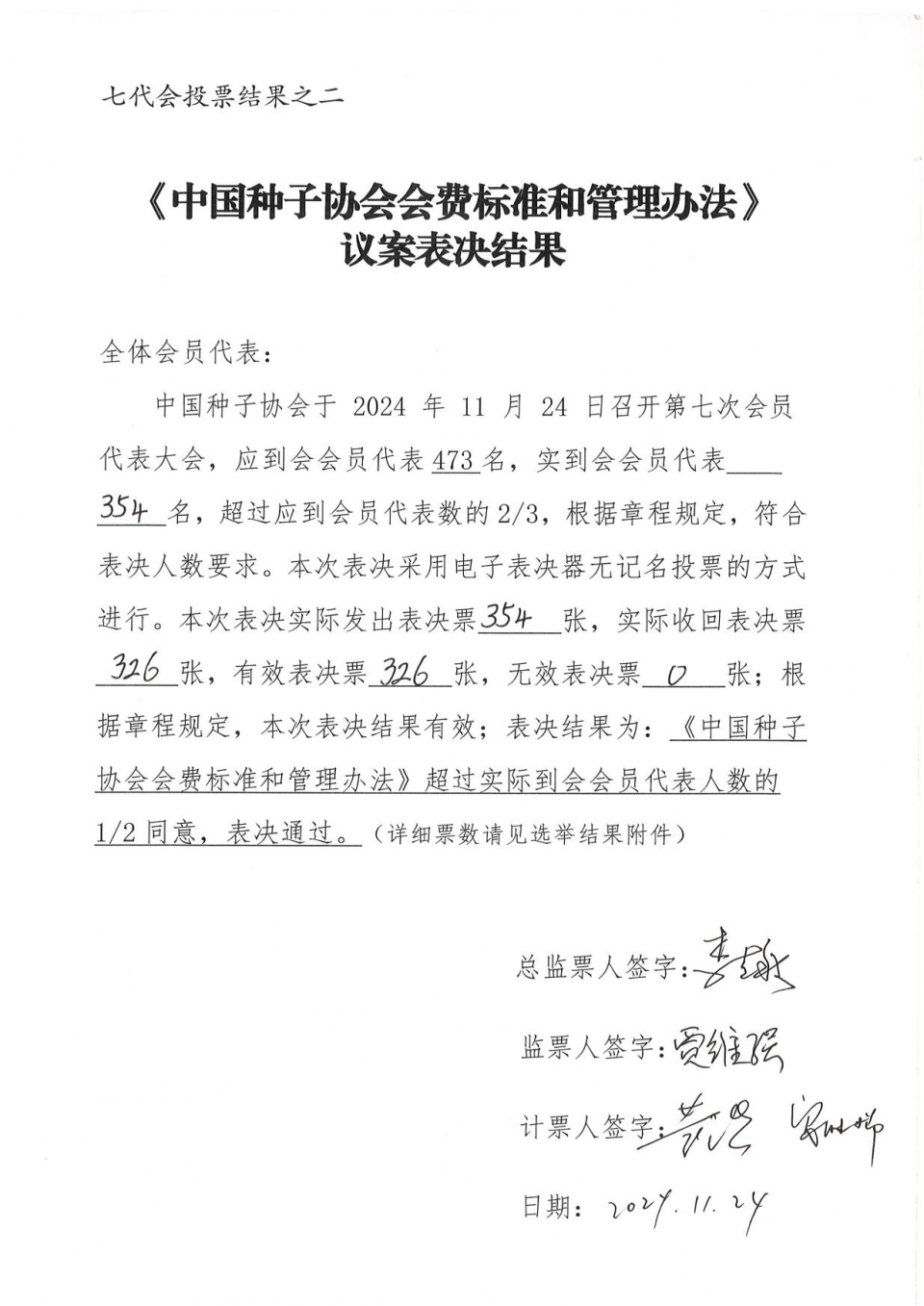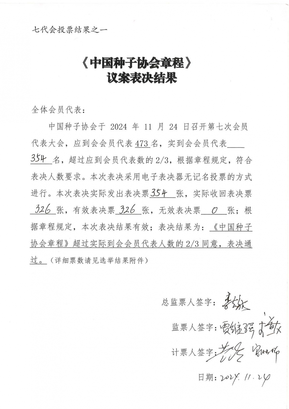 (二)大會經無記名投票表決通過了《中國種子協會章程》和《中國種子協會會費標準和管理辦法》,投票結果(見附件1)符合章程規定,表決結果有效。